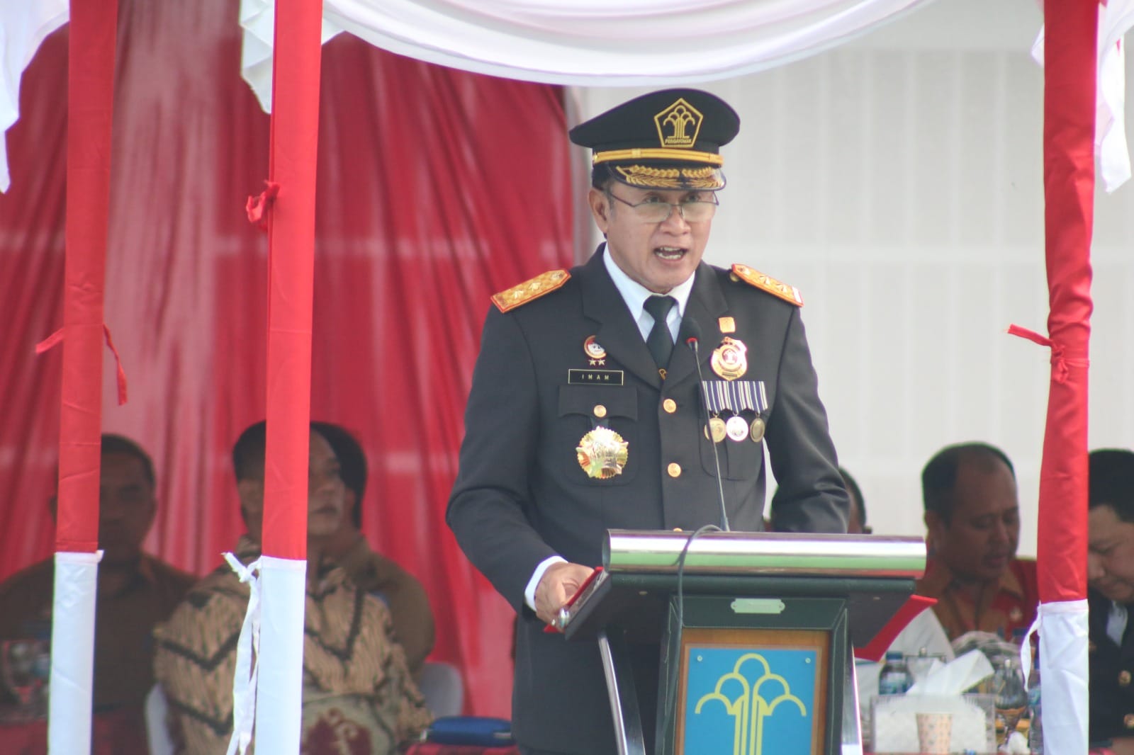“Kami segenap pimpinan Kementerian Hukum dan HAM mengucapkan terima kasih kepada jajaran pemerintah daerah, instansi vertikal, mitra kerja dan segenap Aparatur Sipil Negara (ASN) Kemenkumham atas kerja sama selama ini. Beberapa waktu lalu, kita telah berhasil meraih peringkat pertama implementasi norma, standar, prosedur dan kriteria (NSPK) yang menegaskan bahwa kita profesional dalam bekerja,” kata Kepala Kantor Wilayah, Imam Suyudi membacakan Sambutan Menteri Hukum dan HAM, Yasonna H Laoly.