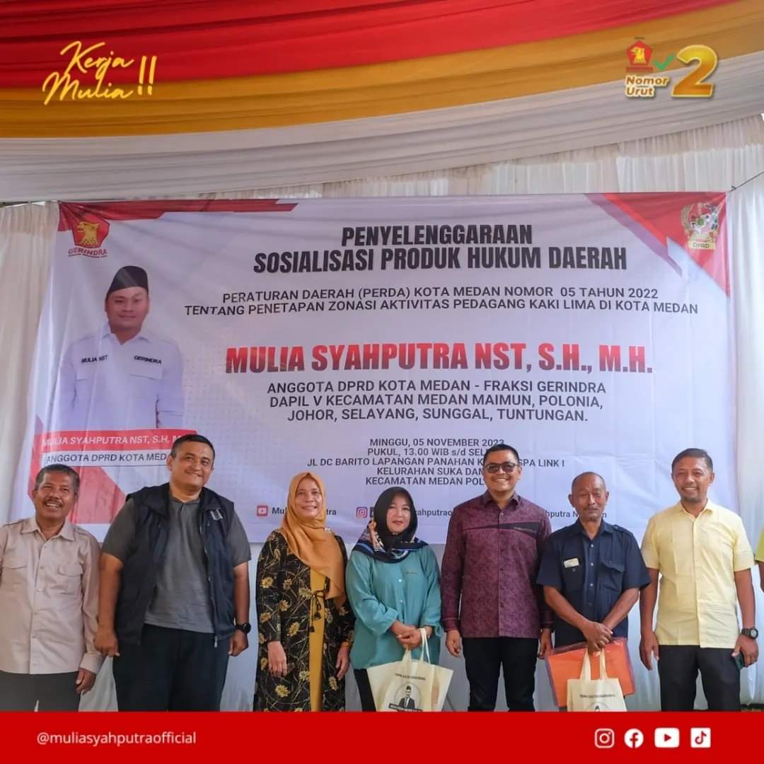 RUBIS.ID, MEDAN - Anggota DPRD Medan Mulia Syahputra Nasution SH MH (Gerindra) dorong Pemko Medan melakukan percepatan penerapan Perda No 5 Tahun 2022 tentang Penetapan Zonasi Aktivitas Pedagang Kaki Lima. Melalui penerapan Perda dipastikan Pedagang Kaki Lima (PK5) akan lebih sejahterah serta estetika kota semakin tertata indah.