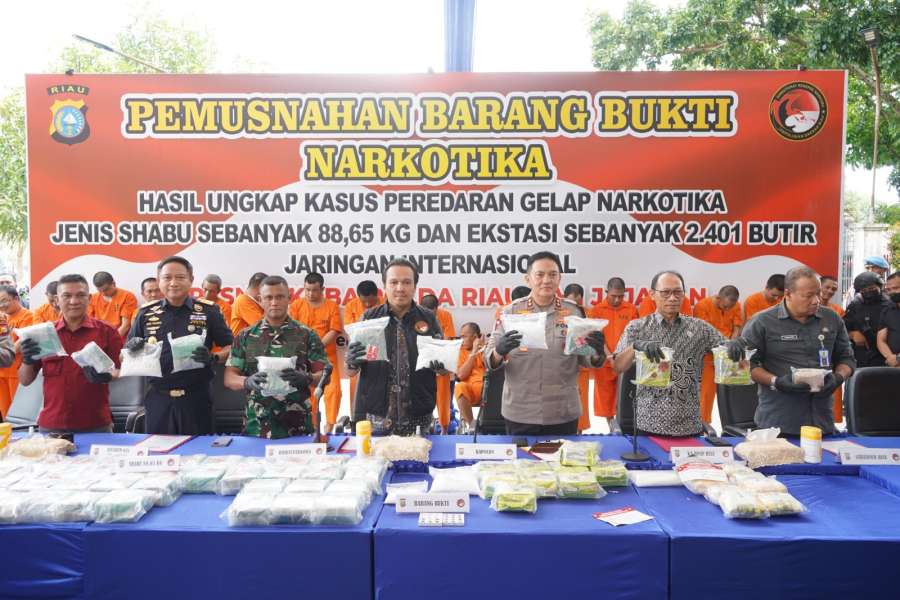RUBIS.ID, PEKANBARU - Polda Riau melaksanakan pemusnahan barang bukti narkotika hasil pengungkapan dari jaringan internasional, Jumat (26/4/2024). Barang bukti yang dimusnahkan yakni 88,65 kilogram sabu dan 2.401 butir pol ekstasi.
