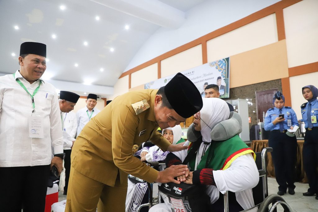 RUBIS.ID, MEDAN – Pj Gubernur Sumatera Utara Hasanuddin bersama Kepala Kantor Wilayah Kementerian Agama Provinsi Sumatera Utara H. Ahmad Qosbi, S.Ag, MM melepas keberangkatan jamaah calon haji (calhaj) kelompok terbang (Kloter) 1 asal Kabupaten Asahan, Senin (13/5/2024) di Aula Madinatul Hujjaj Asrama Haji Medan.