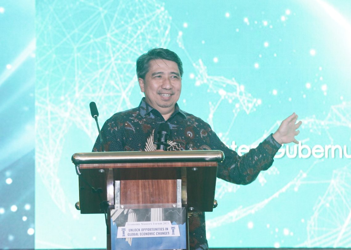 Asisten Gubernur sekaligus Kepala Departemen Kebijakan Makroprudensial Bank Indonesia, Solikin M. Juhro, saat menyampaikan paparan dalam acara Unlock Opportunities in Global Economic Change yang digelar Infobank di Jakarta, Jumat (29/8/2025).