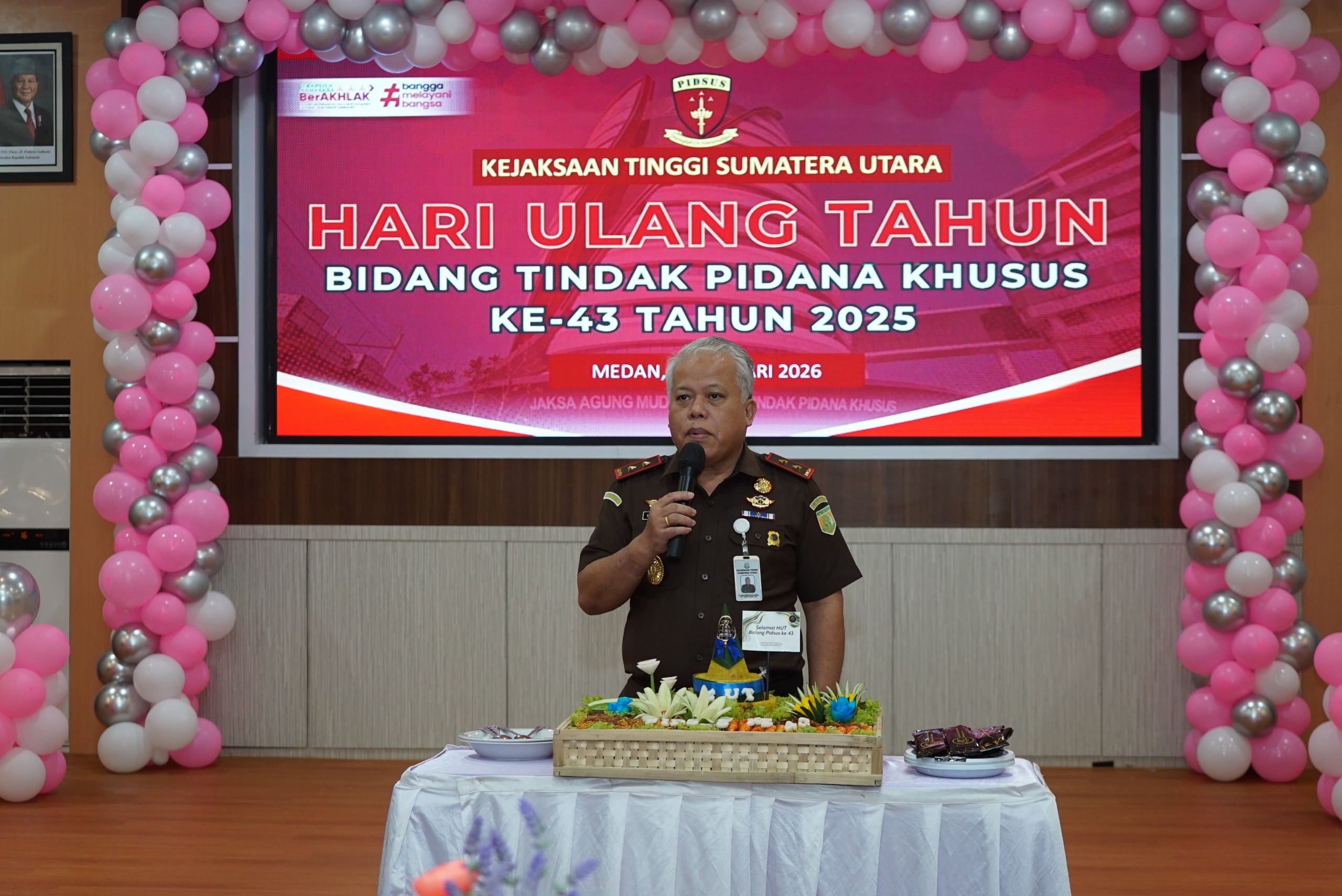 RUBIS.ID, MEDAN – Kepala Kejaksaan Tinggi Sumatera Utara (Kajati Sumut) Dr. Harli Siregar, SH, M.Hum bersama Wakil Kepala Kejati Sumut Abdullah Noer Denny, SH, MH, serta para pejabat utama (PJU), koordinator, kepala seksi, jaksa penyidik, jaksa fungsional, dan jajaran Bidang Tindak Pidana Khusus (Pidsus) Kejati Sumut mengikuti peringatan Hari Ulang Tahun (HUT) ke-43 Bidang Pidana Khusus Kejaksaan Republik Indonesia Tahun 2026.
