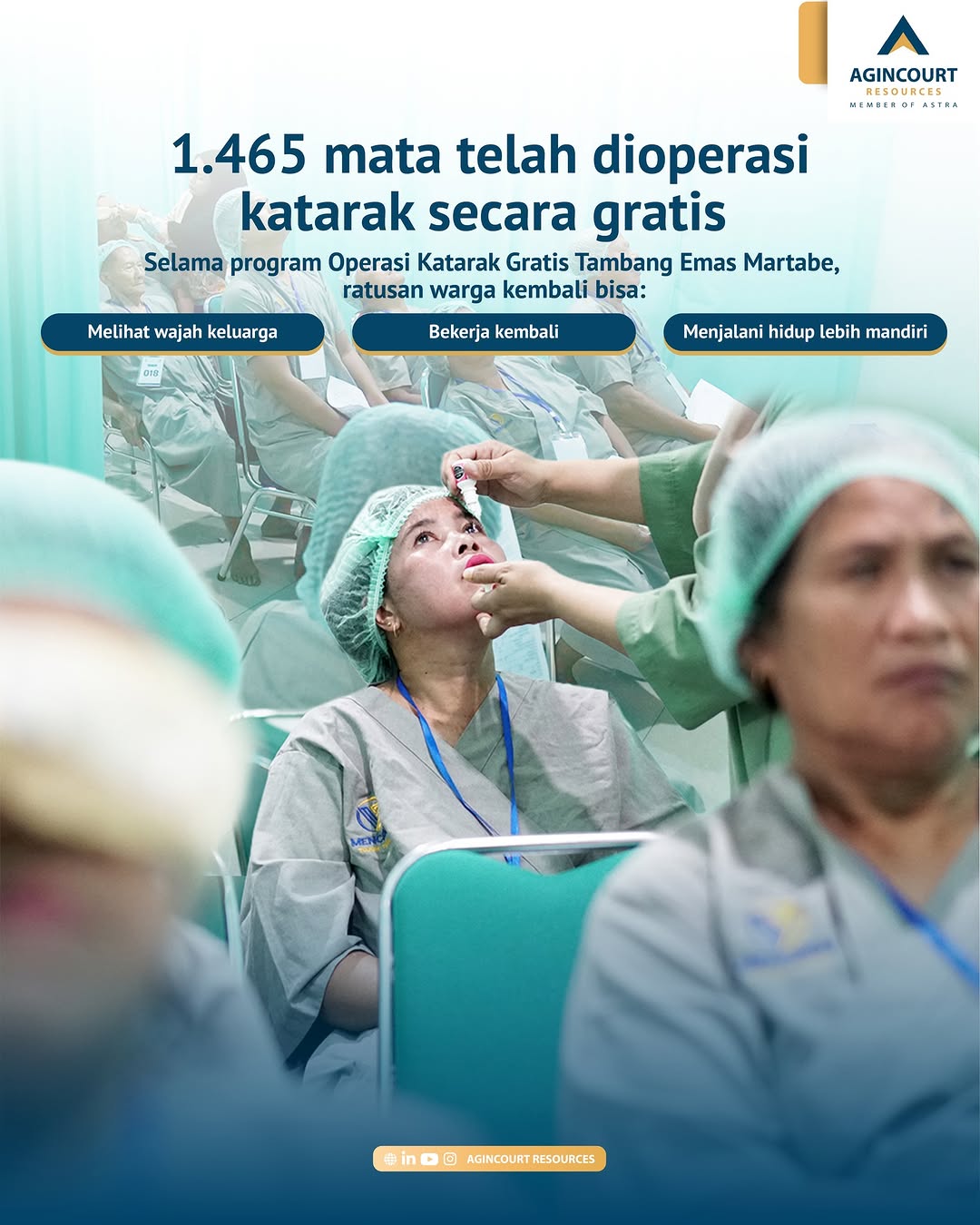 Kegiatan Operasi Katarak Gratis ini sejalan dengan komitmen Agincourt Resources dalam menjalankan praktik pertambangan yang berkelanjutan dan bertanggung jawab, serta mendukung pembangunan sosial masyarakat melalui berbagai program Pengembangan dan Pemberdayaan Masyarakat (PPM), khususnya di bidang kesehatan.