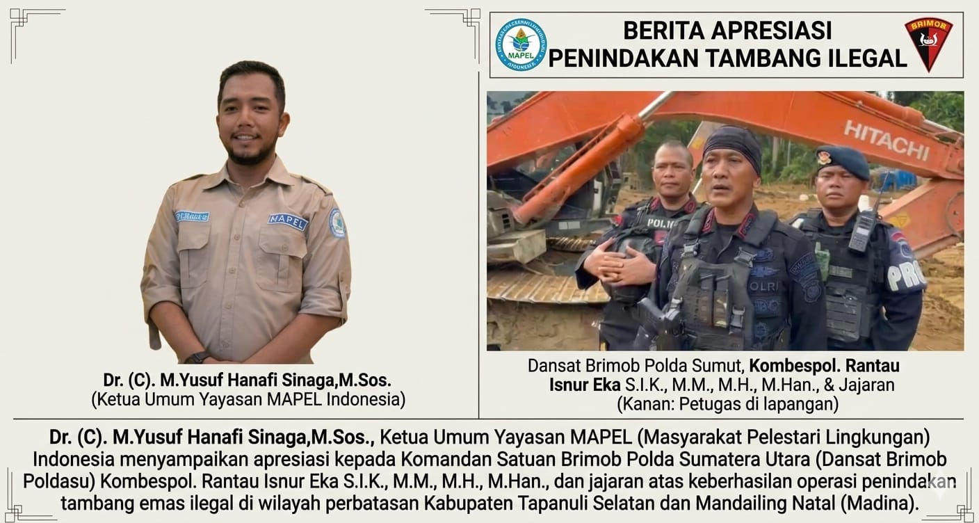 Sementara itu, Ketua Umum Yayasan MAPEL Indonesia, M. Yusuf Hanafi Sinaga, menyampaikan apresiasi atas langkah tegas Polda Sumatera Utara dalam menindak aktivitas tambang emas ilegal di wilayah Mandailing Natal.