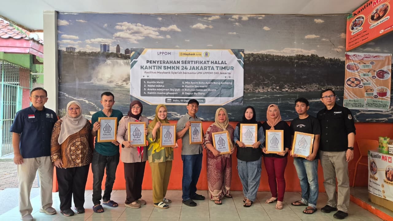 Teks foto: Penyerahan sertifikat halal kepada pelaku usaha kantin SMKN 24 Jakarta Timur hasil fasilitasi Maybank Indonesia Syariah bersama LPPOM DKI Jakarta sebagai bagian dari penguatan ekosistem halal di lingkungan pendidikan.(Dok.Ist)
