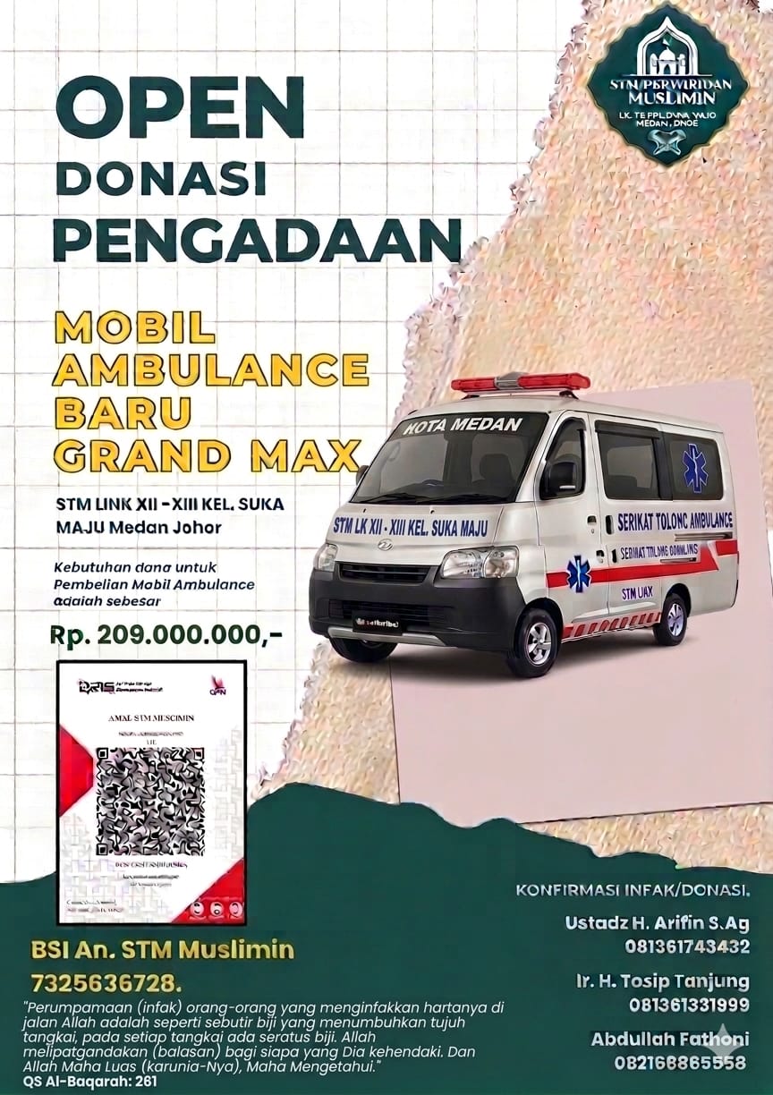 RUBIS.ID, MEDAN – Serikat Tolong Menolong (STM) Perwiridan Muslimin yang berbasis di Lingkungan XII - XIII, Kelurahan Suka Maju, Kecamatan Medan Johor, resmi membuka penggalangan donasi untuk pengadaan satu unit mobil ambulans baru.