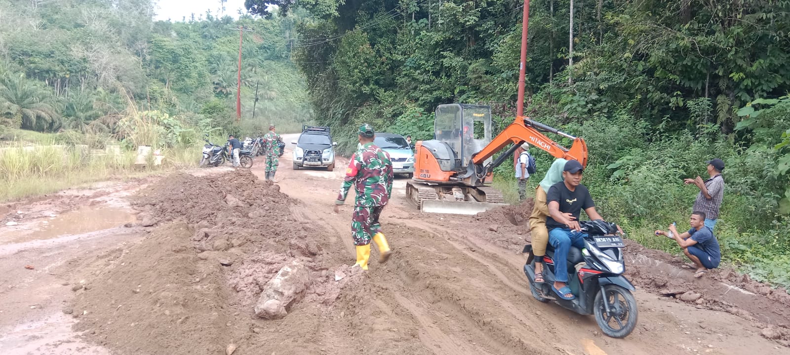 Komandan Koramil 16 Batang Natal, Kapten Inf Zamril, bersama anggotanya turun langsung memimpin gotong royong bersama warga untuk menimbun jalan berlubang dan amblas yang selama ini dikeluhkan masyarakat.